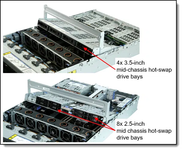 32x 2.5-inch hot-swap drive bays, by using combinations of front-accessible (up to 24 bays), mid bays (8 bays) and rear-accessible (4 bays).